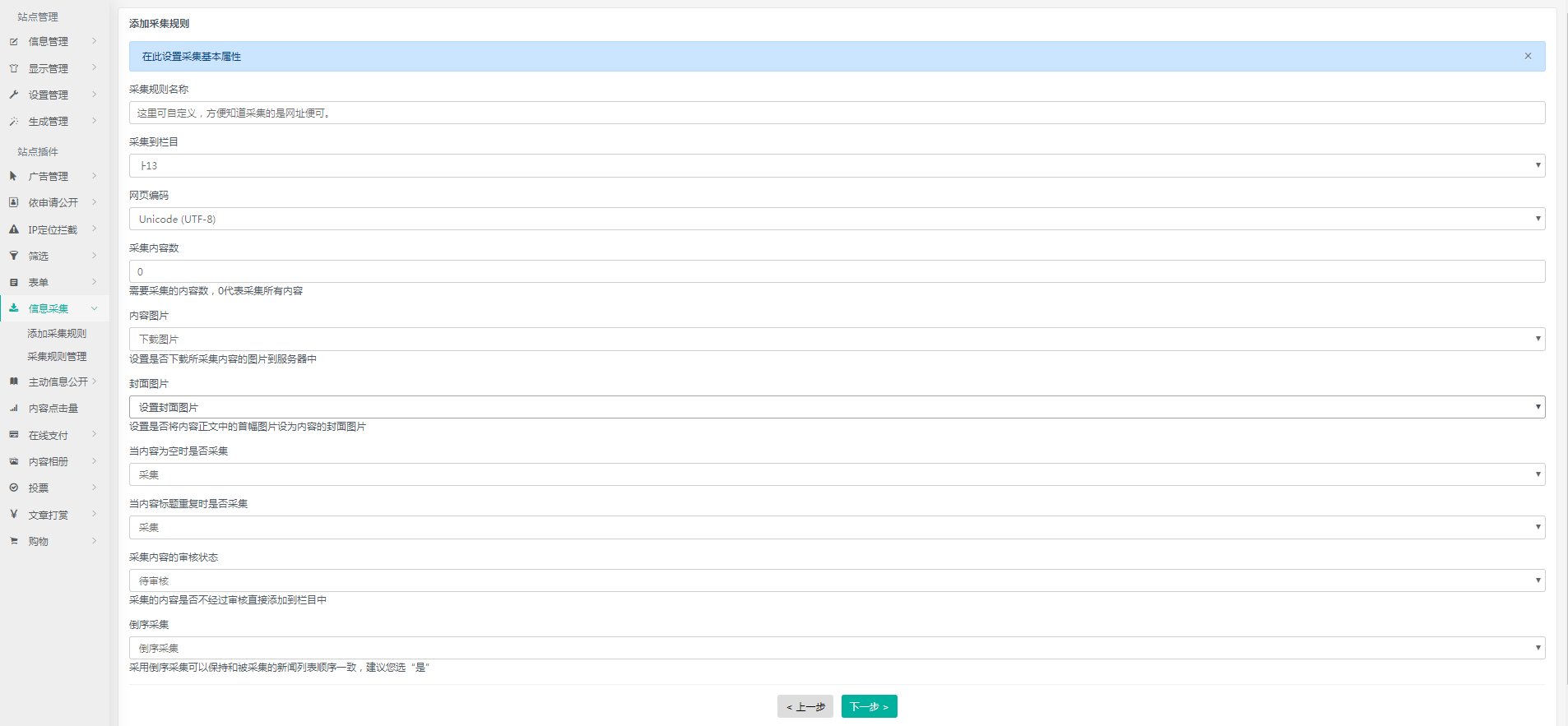 点击系统左侧- 站点插件 下的 信息采集 右侧进入界面是采集规则管理。然后点击添加信息采集