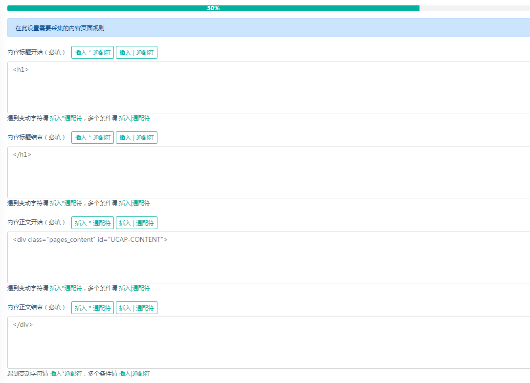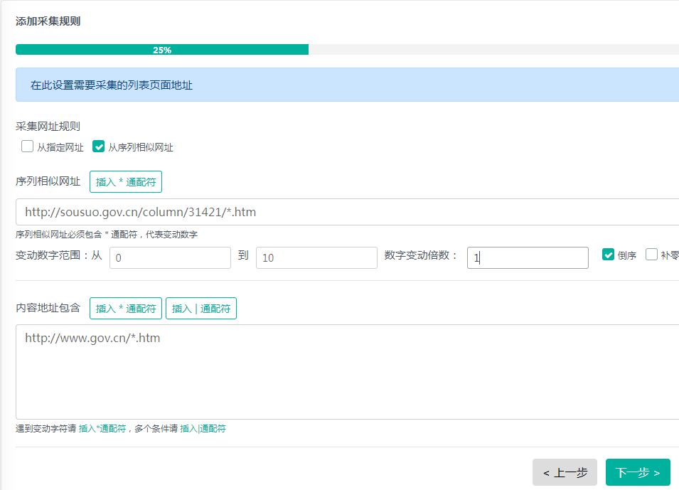 内容地址包含 用于过滤采集的内容地址,系统将从列表页中选择指定格式的地址作为内容页面的链接。如上图所示,系统仅采集包含http://www.gov.cn/*.htm字符串的内容页面,其中*代表任意字符。