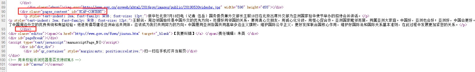 以国务院要闻频道为例,首先进入内容页面,在浏览器中选择“查看源文件”获取到内容页面的代码。