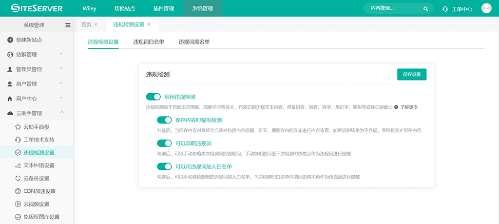 违规检测开启后将自动集成至 SSCMS 系统中。