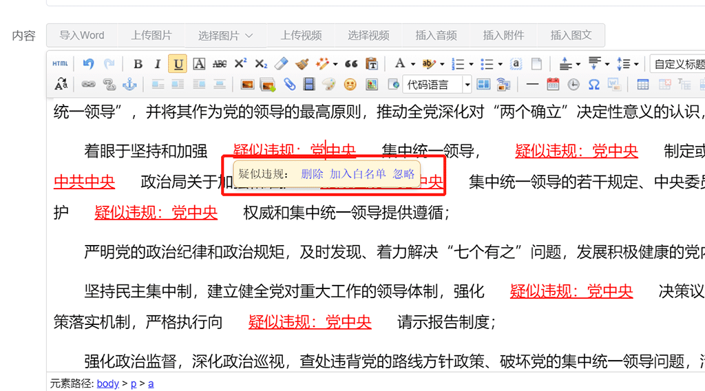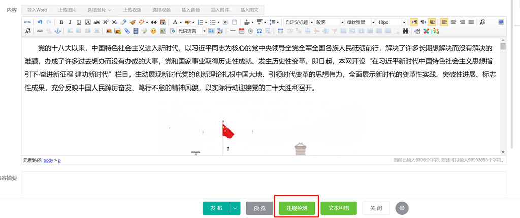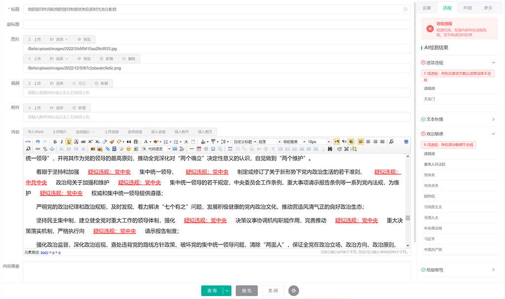 如果在违规检测设置中勾选 保存内容时强制检测,在新增/修改内容界面将不会出现违规检测按钮,我们点击保存或发布按钮时,系统将自动进行违规检测,如果检测出疑似违规词,系统将检测结果以红色高亮显示在编辑器中: