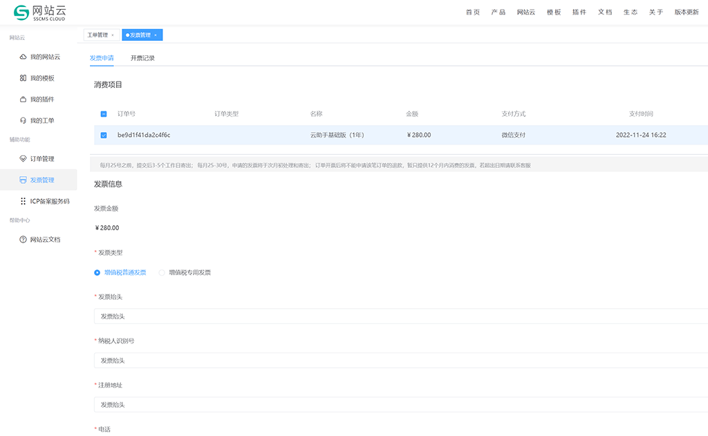 在线支付后,进入 用户中心 -> 发票管理,可以看到支付订单,勾选后将出现开票信息填写界面: