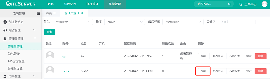 在管理员的右侧点击 编辑 按钮,进入编辑界面: