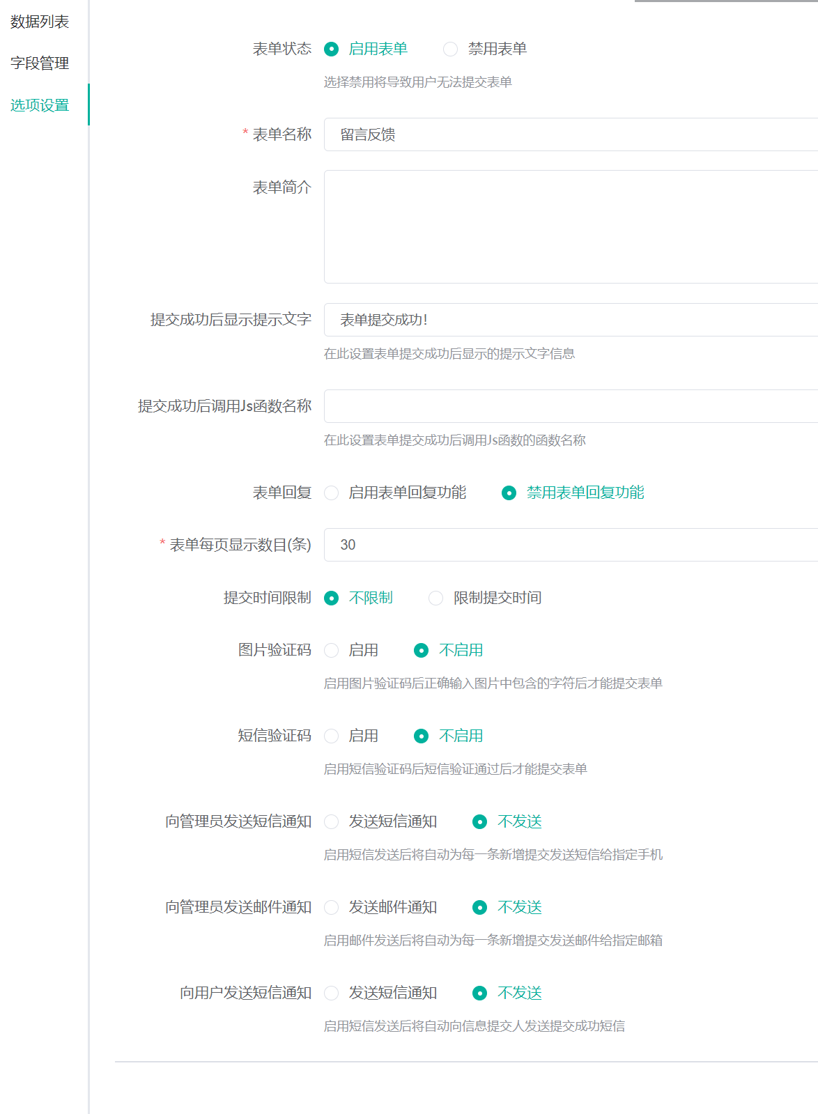 - 向用户发送短信通知 启用短信发送后将自动向信息提交人发送提交成功短信;