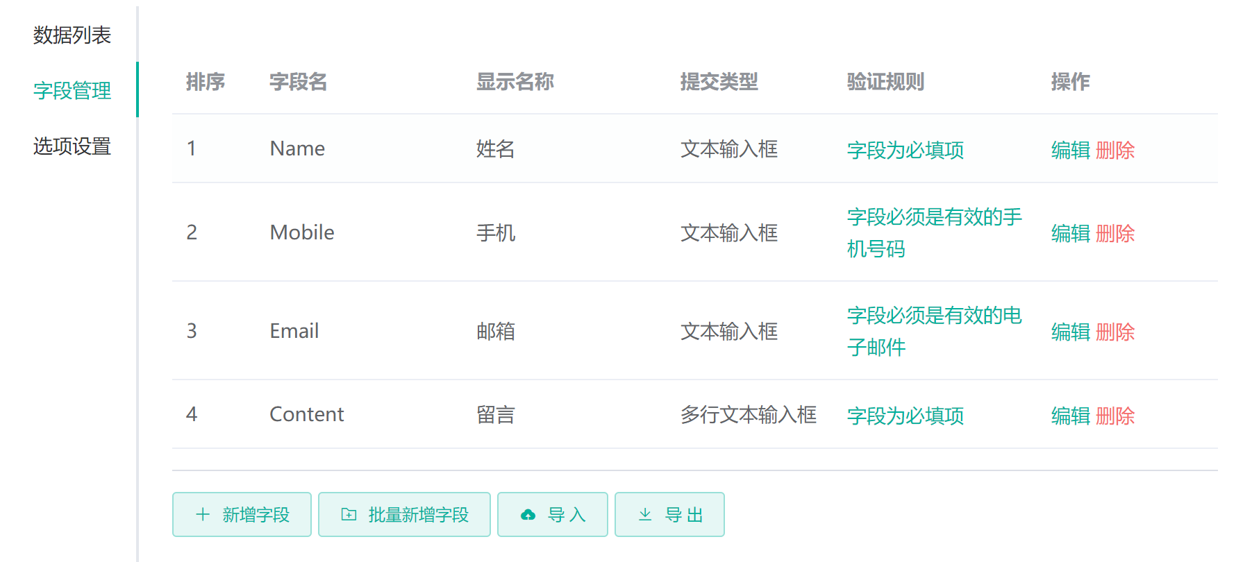 在此可以编辑表单的字段以及验证规则,表单插件支持字段的导出以及导入,可以通过导出导入快速创建相同字段的表单。
