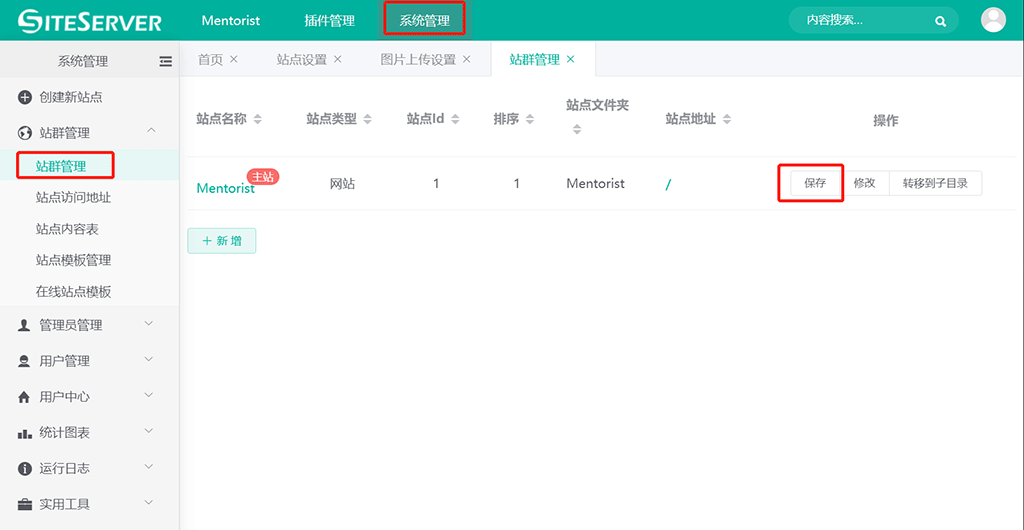 首先,我们需要将搭建在其他环境中的 SSCMS 系统站点保存为模板,进入 SSCMS 系统管理后台,打开 系统管理 > 站群管理 界面,在站点列表右侧点击 保存: