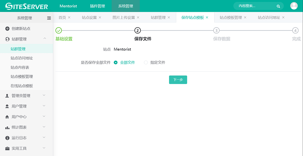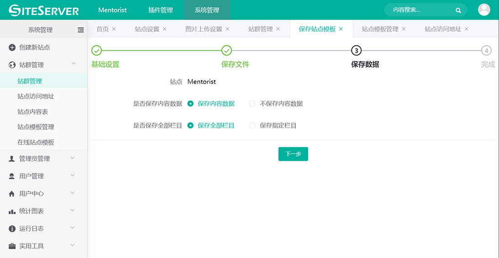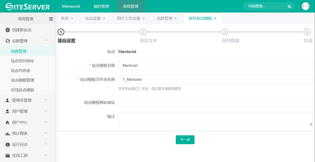 在基础设置界面中设置站点模板名称与文件夹名称后点击下一步: