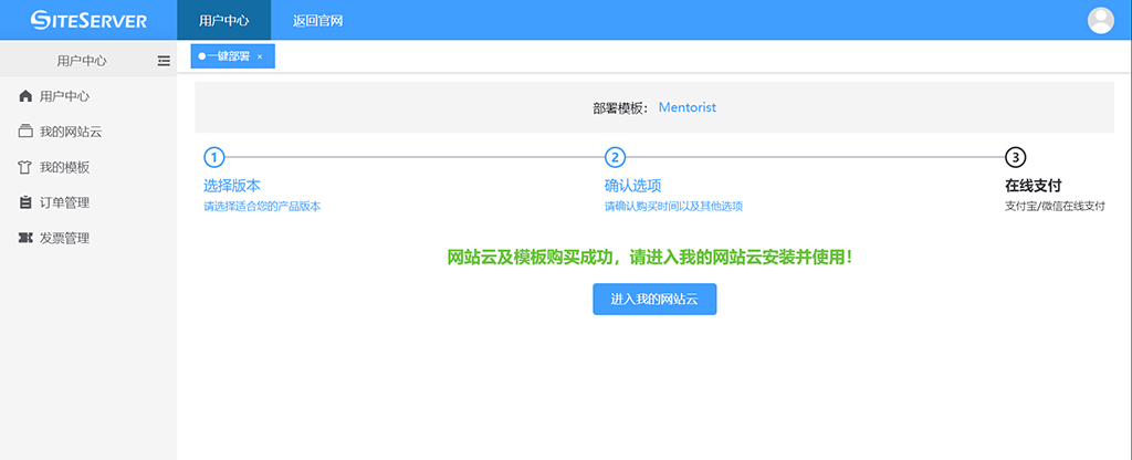 选定版本后进入支付界面确认界面,点击确定并支付完成后将显示网站云及模板购买成功界面: