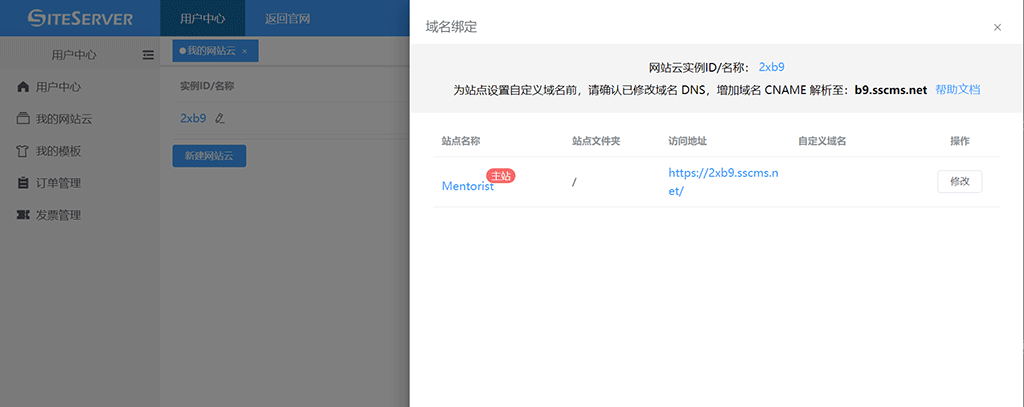 我们需要根据提示,修改域名 DNS,增加域名 CNAME 解析至对应的地址(例如示例中网站云域名 CNAME 是解析至 b9.sscms.net)。