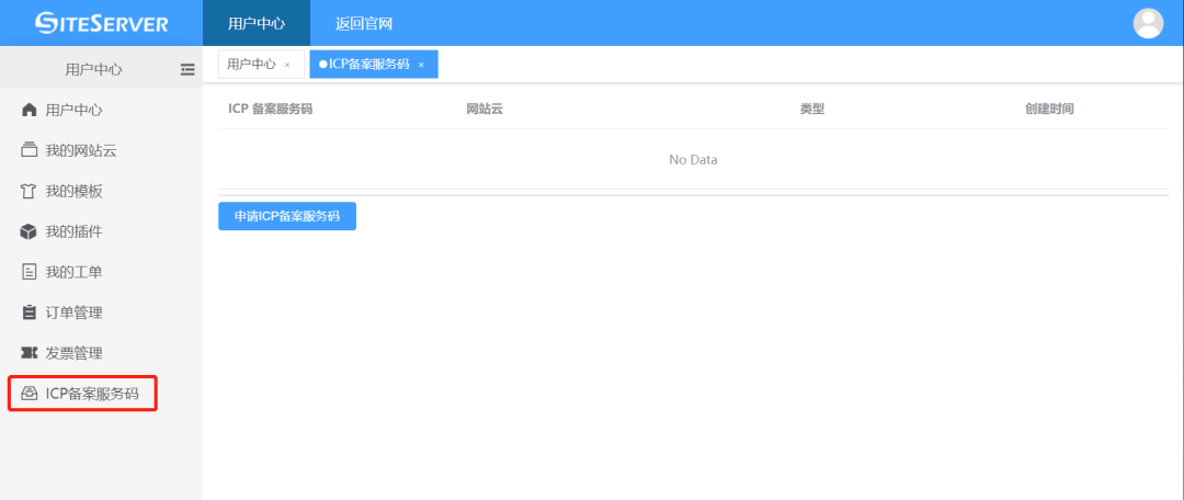 登录 SSCMS 官网 (opens new window),进入用户中心,在左侧能看到ICP备案服务码菜单: