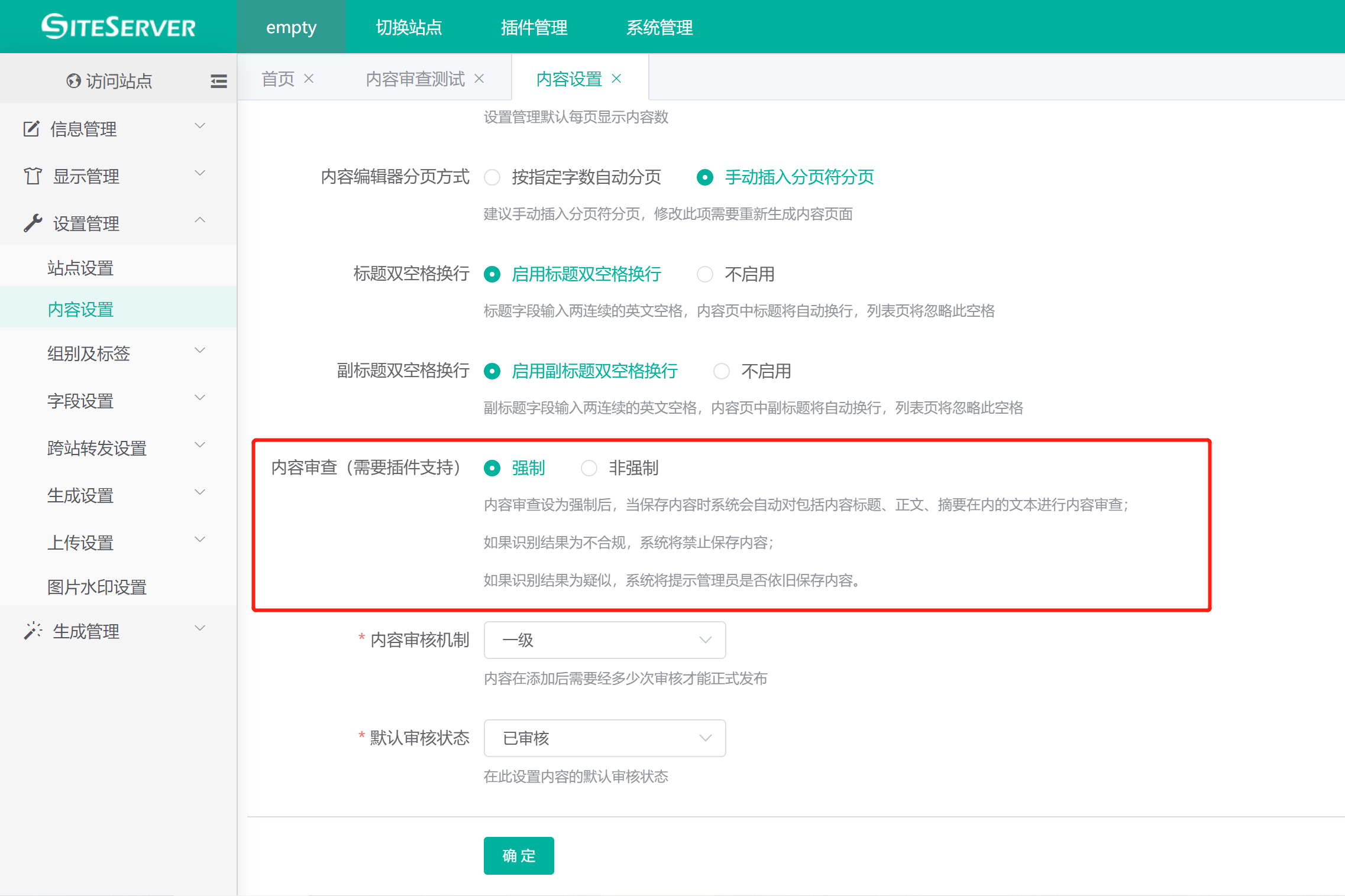 内容审查设为强制时,当管理员在内容编辑界面保存内容时,系统会自动对包括内容标题、正文、摘要在内的文本进行内容审查: