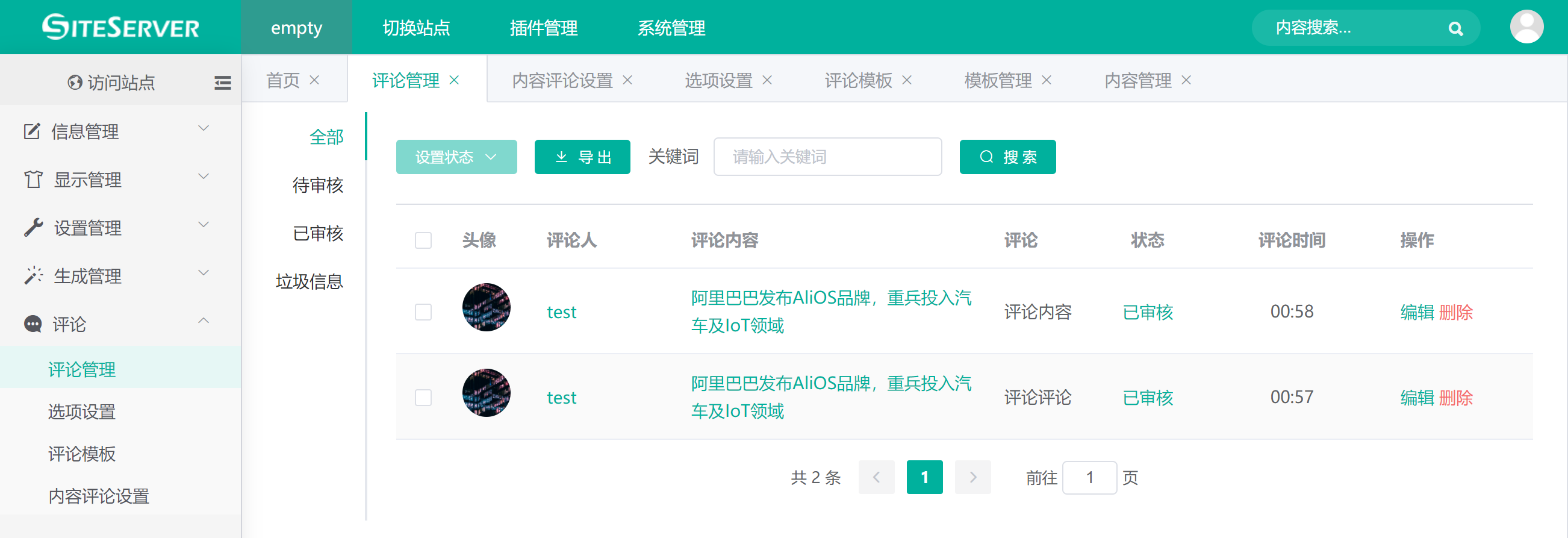 进入站点 评论 -> 评论管理 界面,可以看到当前站点的所有评论:
