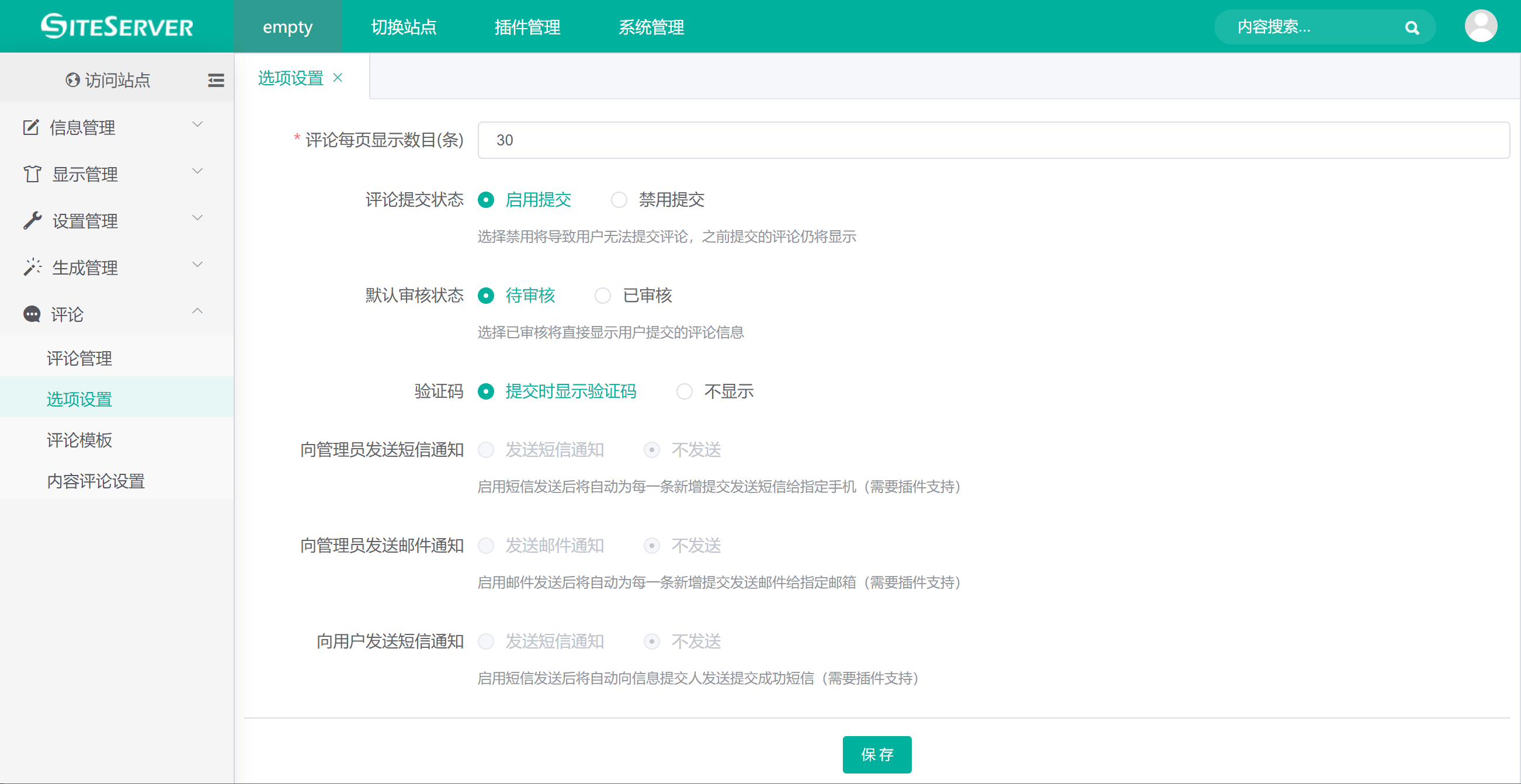 点击站点 评论 -> 内容评论设置,进入内容评论设置界面: