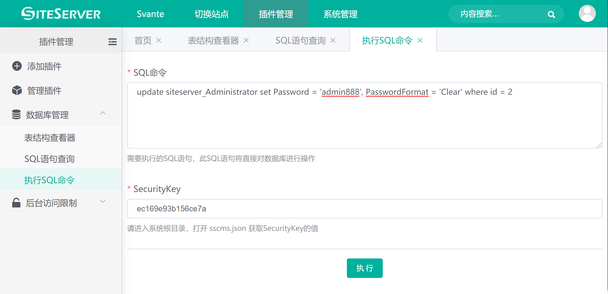 由于执行SQL命令是高危操作,系统将需要管理员输入 SecurityKey,如果不知道 SecurityKey 的值,需要进入服务器,打开系统根目录下的 sscms.json 文件,我们将看到类似数据:
