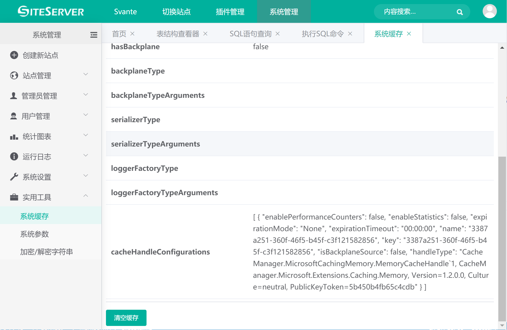 如果SQL命令执行完毕,SSCMS 后台数据没有发现变化,有可能是因为 SSCMS 系统对数据进行了缓存,可以进入 系统管理 -> 实用工具 -> 系统缓存 界面: