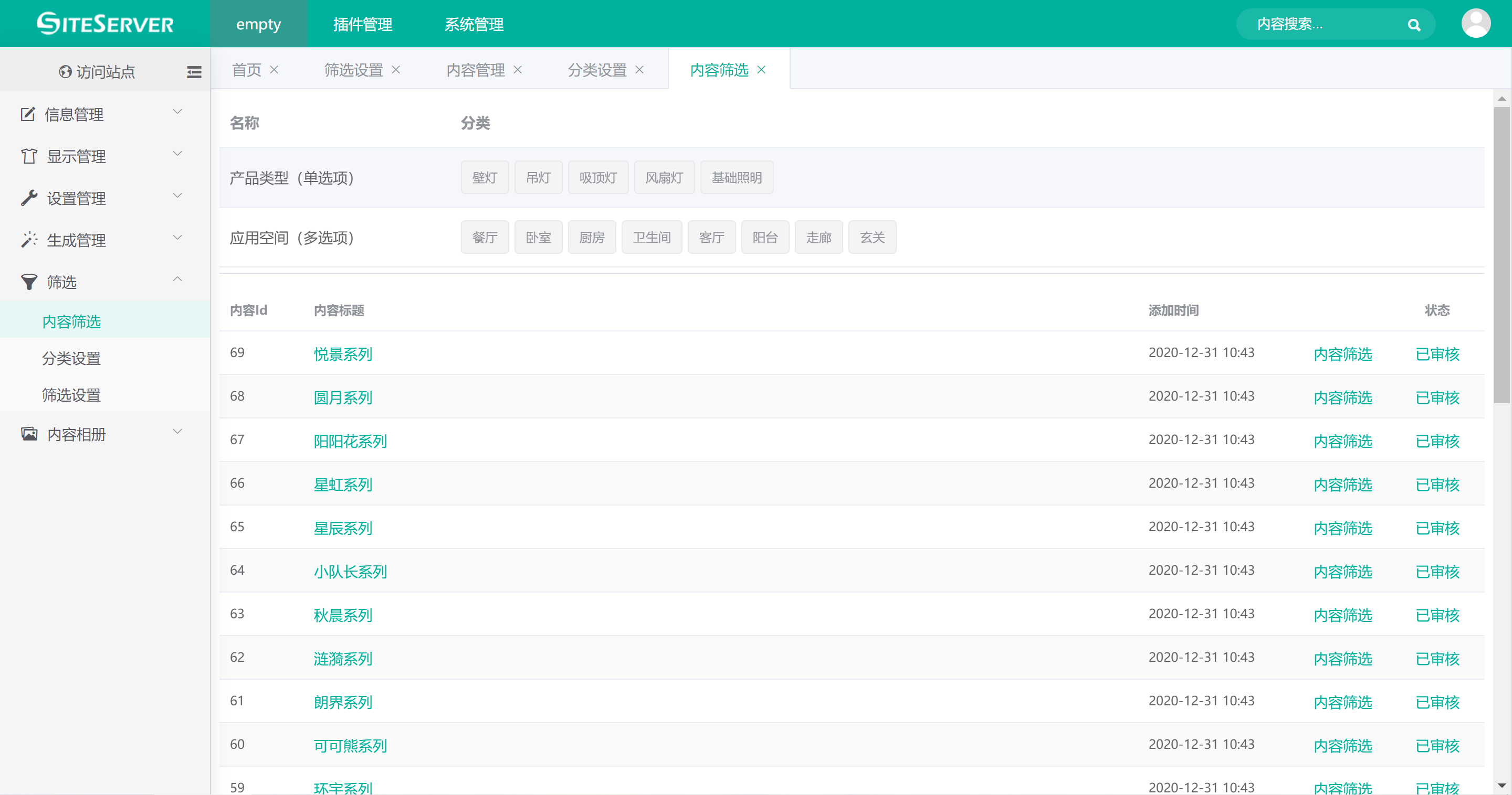 默认将显示 筛选设置 中勾选的栏目下的所有内容,点击对应的筛选项进行筛选,系统将通过分类查询出符合筛选条件的内容列表: