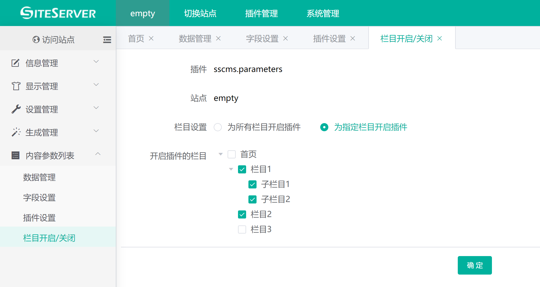 进入站点 内容参数列表 -> 栏目开启/关闭 界面,勾选启用参数列表的栏目,或者选择为所有栏目开启插件: