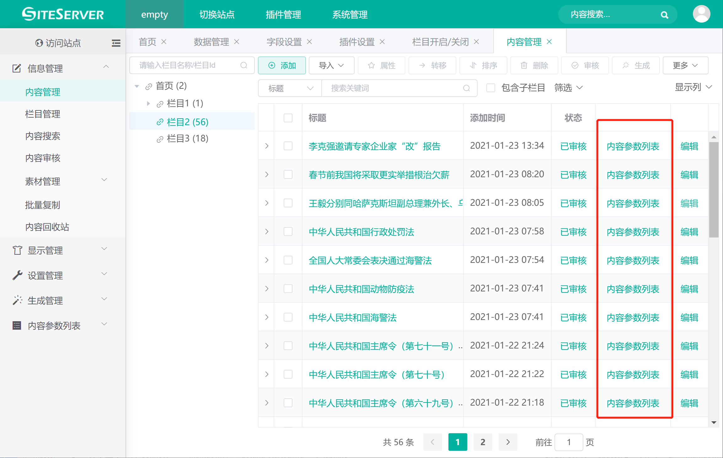 完成栏目设置以及字段设置后,我们可以开始管理指定内容的参数列表了。