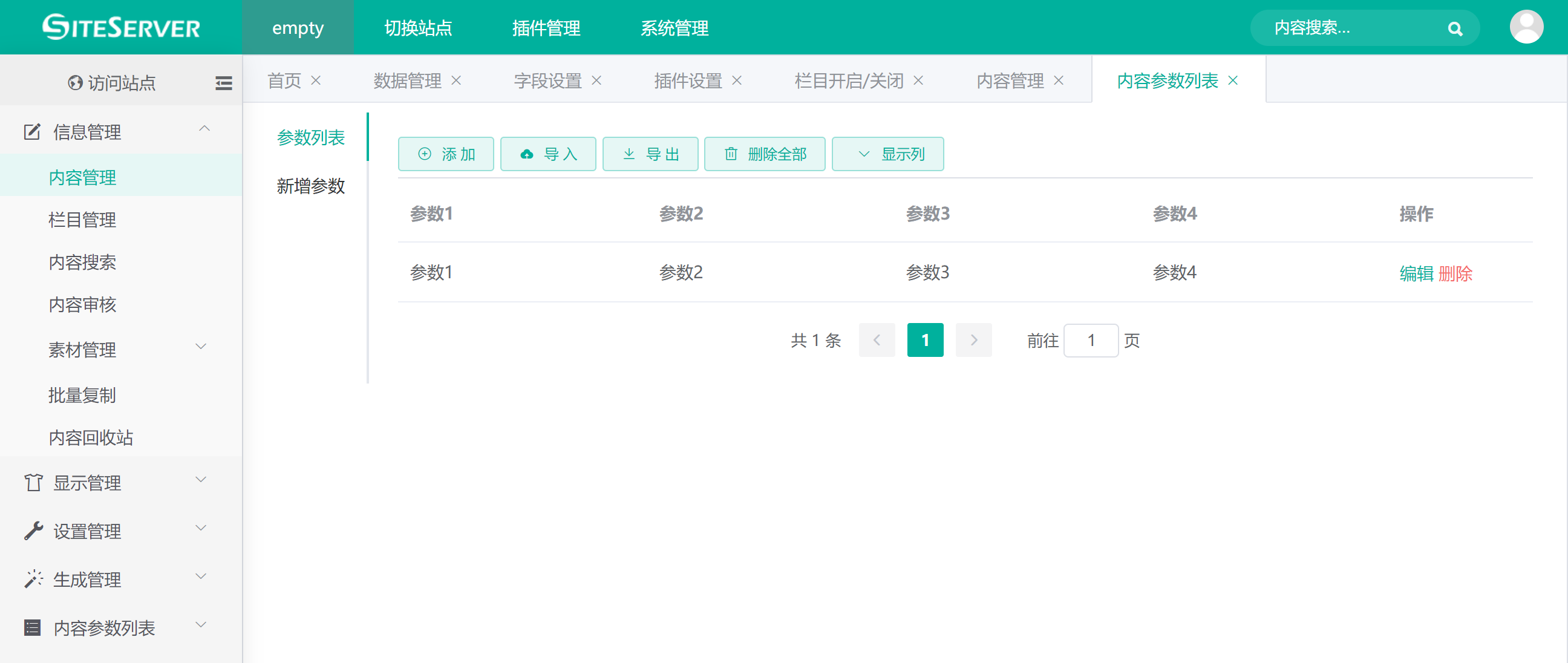 点击链接后进入内容参数管理界面,在此我们可以增删改对应的参数: