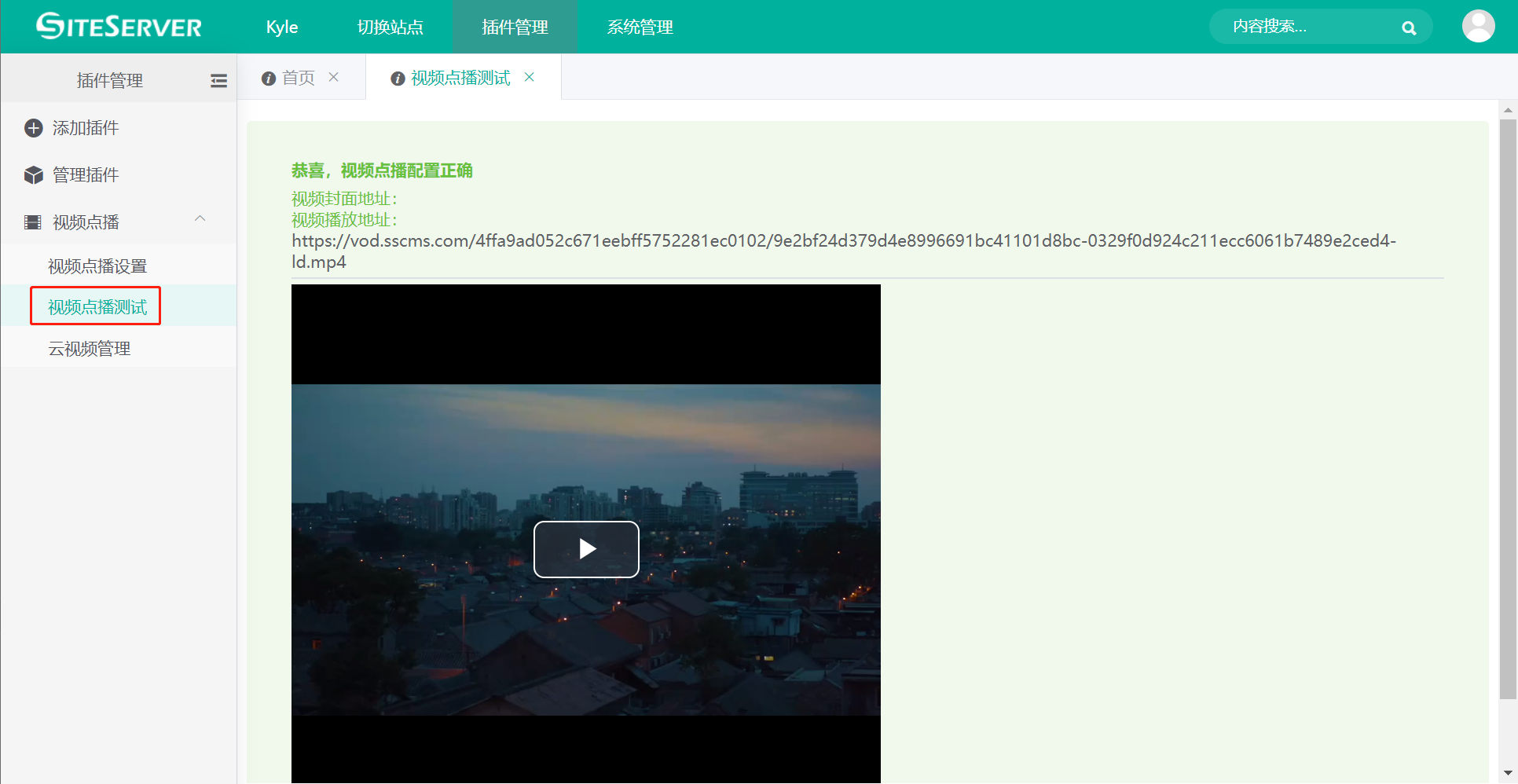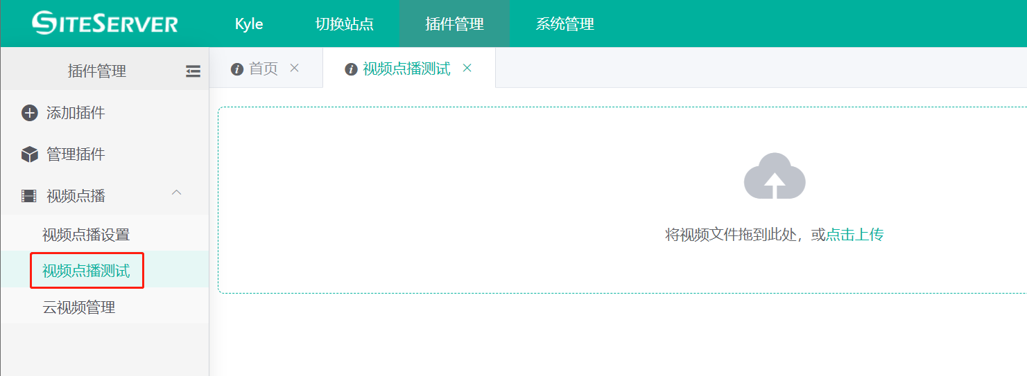 完成视频点播设置后,我们可以开始测试视频点播功能是否能够正常工作,在 SSCMS 后台进入视频点播测试界面: