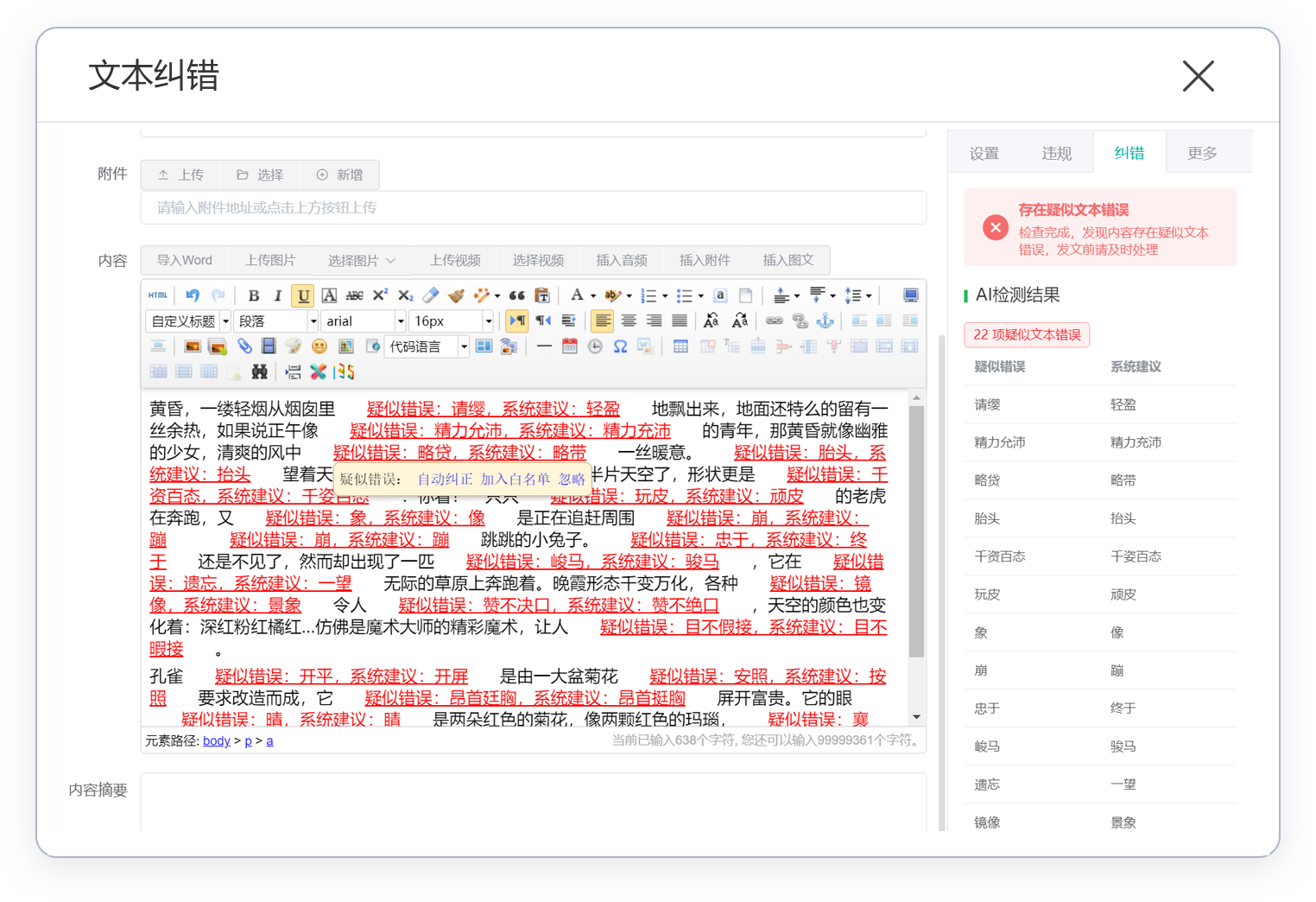 - 文本纠错 - 栏目/内容编辑界面文本纠错。