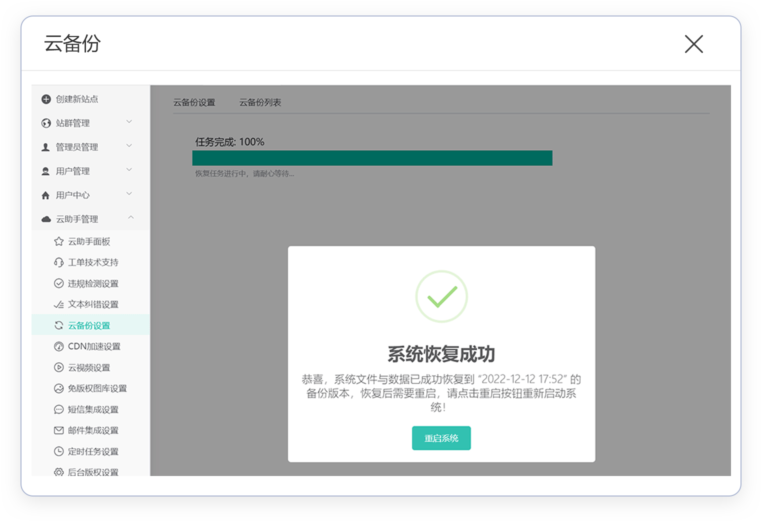 云备份每日自动备份网站实时文件与数据至云端,备份文件无法被删除,您可以将其恢复到任何时间点,避免了数据的意外丢失风险。