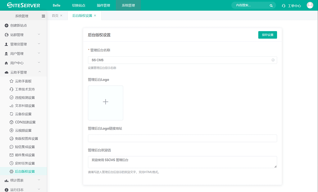 后台版权设置能够自定义 SSCMS 后台的名称、LOGO、链接地址以及版权信息。